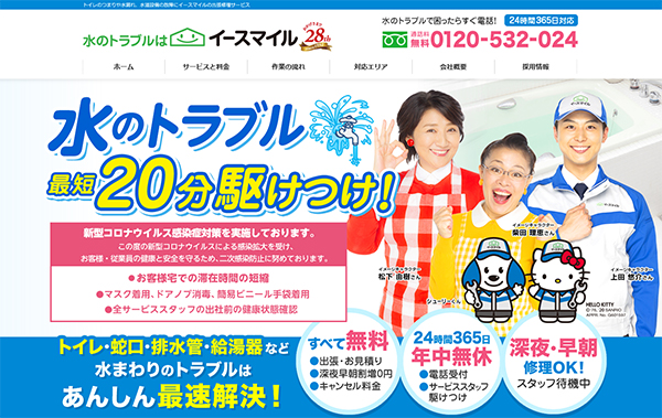 水110番![]() ![]() | イースマイル![]() ![]() | 水道修理センター![]() ![]() | 水のトラブル サポートセンター ![]() ![]() | |